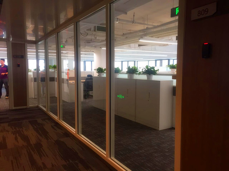 為創(chuàng)造一個舒適,明亮的工作環(huán)境,我們采用通透的全鋼雙玻/單玻防火隔斷系統(tǒng),型材結(jié)構(gòu)設(shè)計恰到好處,采用主型材與進口異形鋼型材(厚度僅為1.5mm)連接作為龍骨支撐,最大強度的保證墻體抗沖擊強度,且具有防火功能,符合國家建筑防火規(guī)范,全面提升辦公場所的安全性,在危險發(fā)生時提供充足的控制現(xiàn)場及人員逃生時間;隔斷系統(tǒng)總體厚度為110mm,可視面60mm,突破傳統(tǒng)粗大框架的束縛,外觀更加簡潔,流暢,塑造出獨具魅力的辦公空間。型材與天地軌之間通過定制連接件連接,運用外扣板卡扣固定龍骨,該設(shè)計方案不僅安全性能高(具有阻燃性),成本低,無污染,無異味,安裝便捷,而且隔斷的反復(fù)利用率可達90%,只需破壞外蓋板,即可將其他型材及玻璃毫無損壞的拆卸下來。