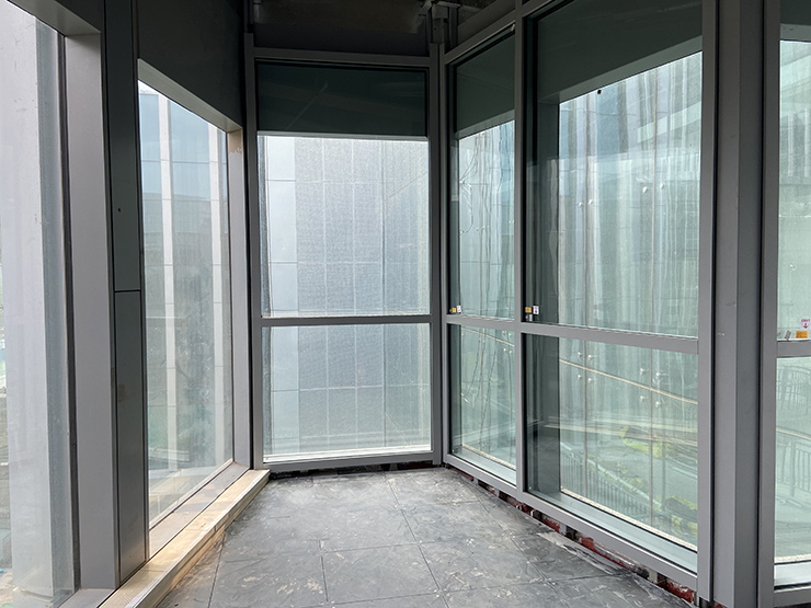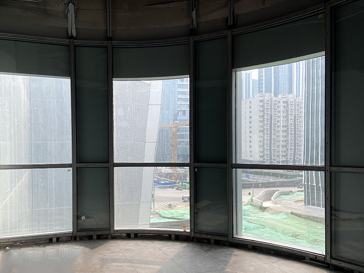 該項(xiàng)目外幕墻采用GMQ防火幕墻系統(tǒng)(滿足防火極限1.0h),共計(jì)約524.91平米(平面幕墻與彎弧幕墻)。室內(nèi)防火隔斷采用GMQ防火疊加系統(tǒng),共計(jì)160平米,幕墻外立面整體效果簡(jiǎn)潔大方,線條規(guī)整,比例勻稱,可視面僅為60mm,可做出超大跨度,在保證高強(qiáng)度和高穩(wěn)定性的基礎(chǔ)上使玻璃面積最大化,采光效果更加。面材采用25mm復(fù)合防火玻璃+LOW-E玻璃,在滿足防火性能的基礎(chǔ)上,還具有優(yōu)異的隔熱、保溫性能,可大大降低因輻射而造成的室內(nèi)熱能向室外的傳遞,可達(dá)到理想的節(jié)能效果,實(shí)現(xiàn)冬暖夏涼的舒適效果。