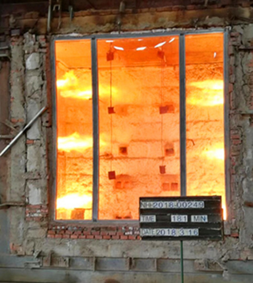非隔熱型鑲玻璃構(gòu)件的耐火性能試驗是根據(jù)GBT/12513《鑲玻璃構(gòu)件耐火試驗方法》標準進行的,將防火玻璃與框架組合好后鑲嵌在墻洞中。