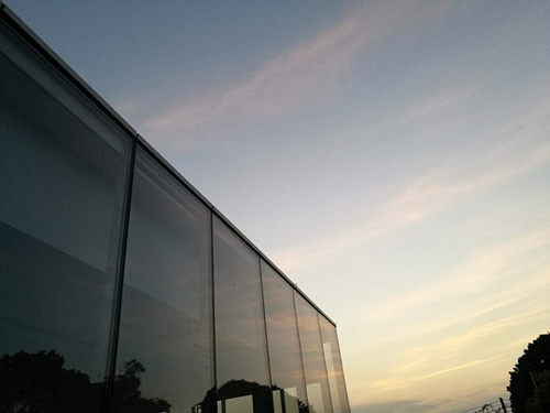 玻璃幕墻:由金屬構(gòu)件與玻璃板組成的建筑外圍結(jié)構(gòu)。