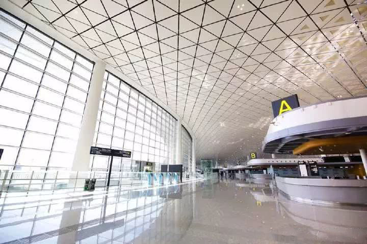 從平面圖上看,建筑平面呈“人”字型,由主樓和東、南、西三個(gè)指廊以及連廊組成,三個(gè)方向的指廊呈放射性布局,這樣的設(shè)計(jì),不但方便旅客步行至各個(gè)登機(jī)口,而且,從安檢口至最遠(yuǎn)的登機(jī)口不超過300米,有效減少了旅客的步行距離和中轉(zhuǎn)時(shí)間。