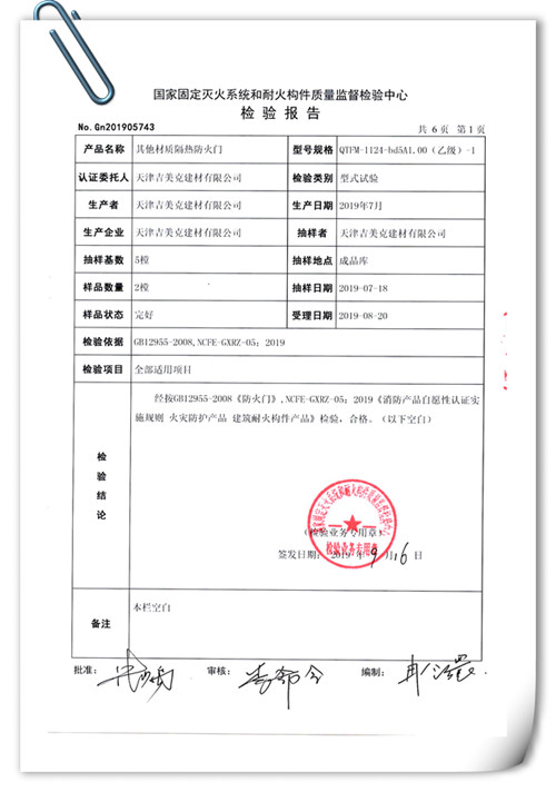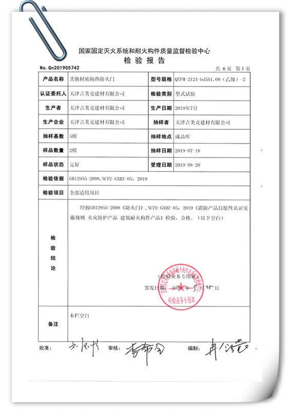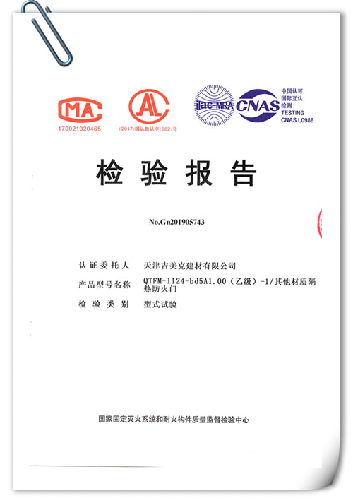 吉美克丨乙級(jí)(A1.00)防火門通過型式檢驗(yàn) |